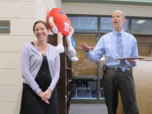 Richmond Hill Elementary School principal Walt Barnes, right, presents RHES special education teacher Nichole Burrows with the plaque given annually to the Bryan County Special Education Teacher of the Year.