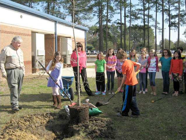In celebration of Georgia Arbor Day, Fred Warnell and Clayton Tillman planted a bald cypress tree Tuesday at G.W. Carver Elementary School. Warnell and Tillma are Bryan County district supervisors with the Coastal Soil and Water Conservation District. Warnell also is a registered forester. Amy Bell, soil-conservation technician with the Natural Resources Conservation Service, assisted with materials from NRCS. Angie Smith’s fifth-grade class is studying plants, and planting the tree reinforced studied concepts for students.