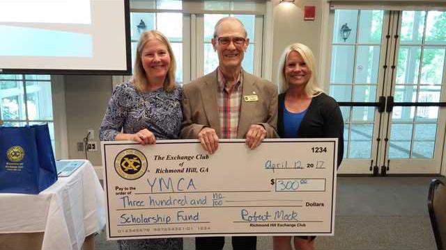 Richmond Hill Exchange Club President Bob Mock presented a $300 donation to YMCA volunteer Lee Ergle and YMCA Executive Director Mary Arocha.