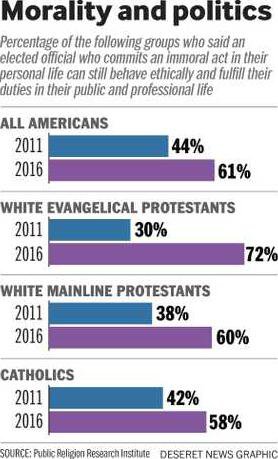 Six-in-10 white mainline Protestants, 58 percent of Catholics and nearly three-quarters of white evangelical Protestants (72 percent) said in 2016 that an elected official who commits an immoral act in private can still behave ethically and fulfill their professional duties, compared with 38 percent, 42 percent and 30 percent, respectively, five years earlier, Public Religion Research Institute reported.