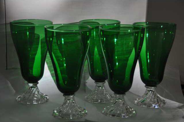 My glasses come from the third line of stemmed glasses Anchor Hocking made to go with a bubble pattern it use for plates and bowls, called Inspiration. The Inspiration glasses have a swirled, clear glass foot with alternating twisted columns of bubbles and solid glass. It was Anchor Hockings premium line of glasses, produced only in emerald-green, given the nickname burple by Weatherman, and sold in department stores rather than dime stores.