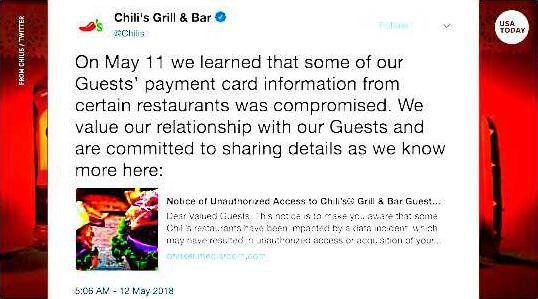 Chilis first learned of the breach last Friday. It will now work with a third-party company to see how many customers were specifically affected.