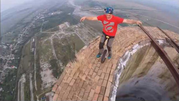 Romanian daredevil Flaviu Cernescu decided it would be a great idea if he and a friend climbed to the top of an 840-foot chimney at CET Trgu Jiu, Romania, and just casually rode a unicycle around the cylinder rim. Oh, and he also juggled oranges, and walked across a tiny steel beam stretched across the open chimney top.
