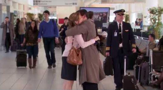 Before he gets on his flight, Pam catches him at the airport, having been away from the office when Scott said goodbye to the rest of his colleagues. The two embrace in a hug and have a brief conversation before Scott heads off to Colorado. The scene was shot at a distance, so the audience doesn't hear more than muffled airport chatter.
