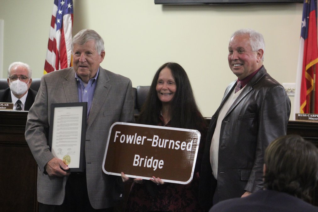 Burnsed and his wife Becky, and Fowler and his wife Teresa, were presented road signs from state Rep. Ron Stephens, who said that wives also serve when husbands are in elected office.
