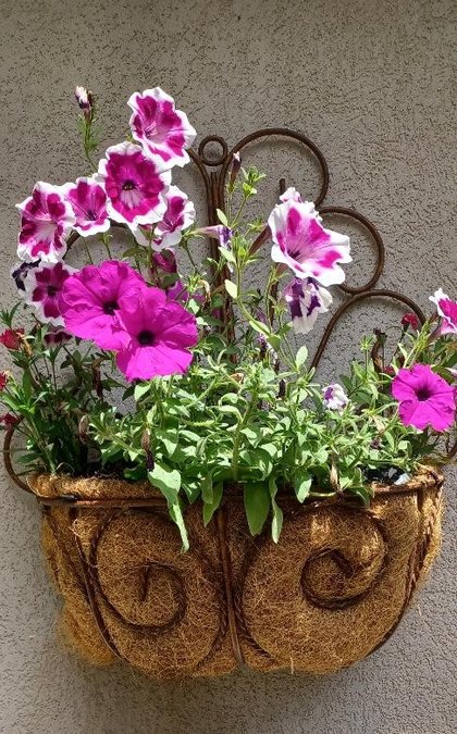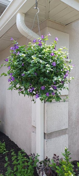 Surrounding the front door entry are several beautiful hanging baskets, midnight salvia, star jasmine, purple petunia, gardenia, and lovely fresh black mulch.