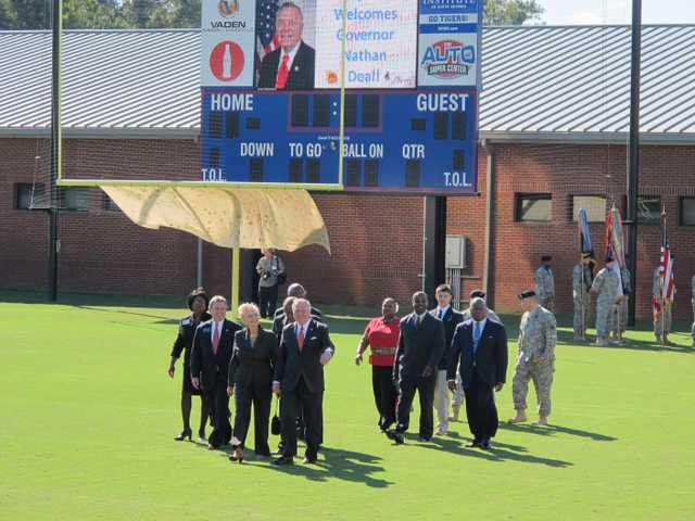 Deal and his wife, Sandra Deal, joined local leaders and State Sen. Buddy Carter, R-Pooler, and Rep. Al Williams, D-Midway, on stage at Bradwell Institute’s Olvey Field. The Liberty County Chamber of Commerce hosted the event.