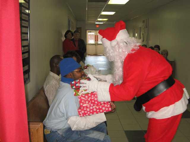 Santa took time from his busy schedule to stop by the Bryan County Courthouse Monday and give gifts to a group of workers the staff affectionately refer to as "the crew."