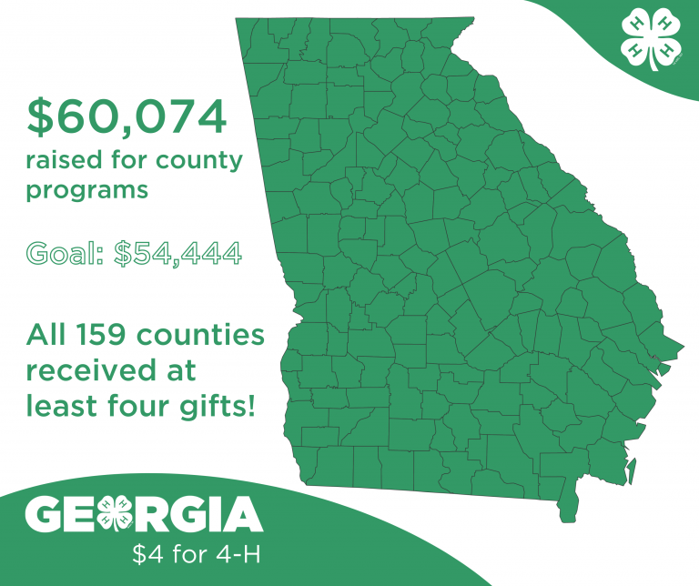 The number four is an important symbol to the 4-H organization. An “H” in each leaf of the four-leaf clover logo represents the tenants of the pledge: head, heart, hands, and health. April 4 marks the fourth day of the fourth month of the year. Counties receiving at least four donations will turn green on a Georgia map that is updated throughout the day.