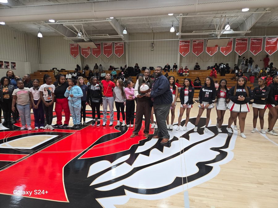 Along with Miller all girl athletes at the high school and middle schools along with any former female athletes in attendance were invited to join together on the floor. Coach Mario Mincey presented Miller with a signed basketball commemorating his service to the school and community.