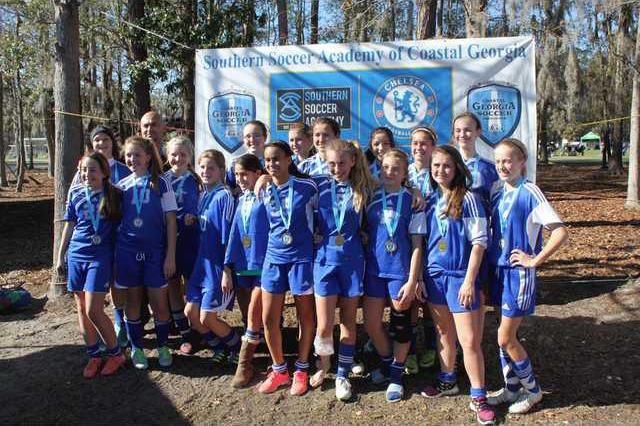The Richmond Hill Soccer Club U14 Girls Select team won its division at the 2013 Savannah Girls Rock Tournament on Jan. 19-20. Coach Marquez’s U14G team defeated the Charlotte Soccer Academy Samba 1-0 and then defeated its sister team, the Charlotte Soccer Academy Mundial 2-0 on Saturday. On Sunday, the team handled WCWAA 4-0 in the semi-finals. In the finals match, the lady Comets upset the Charlotte Soccer Academy Gazelle 3-0 for their champion’s medals.