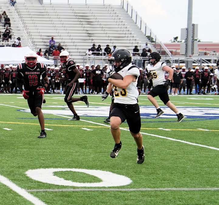In the bottom photo, #23 Braeden Parsons runs on the right side for 10- plus yards early in the first half.