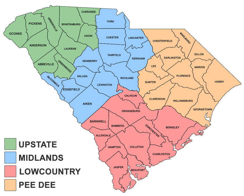 Anyhow, in South Carolina, from left to right you have the Upstate, the Midlands, and on the right the Lowcountry and Peedee kind of stacked on top of each other.