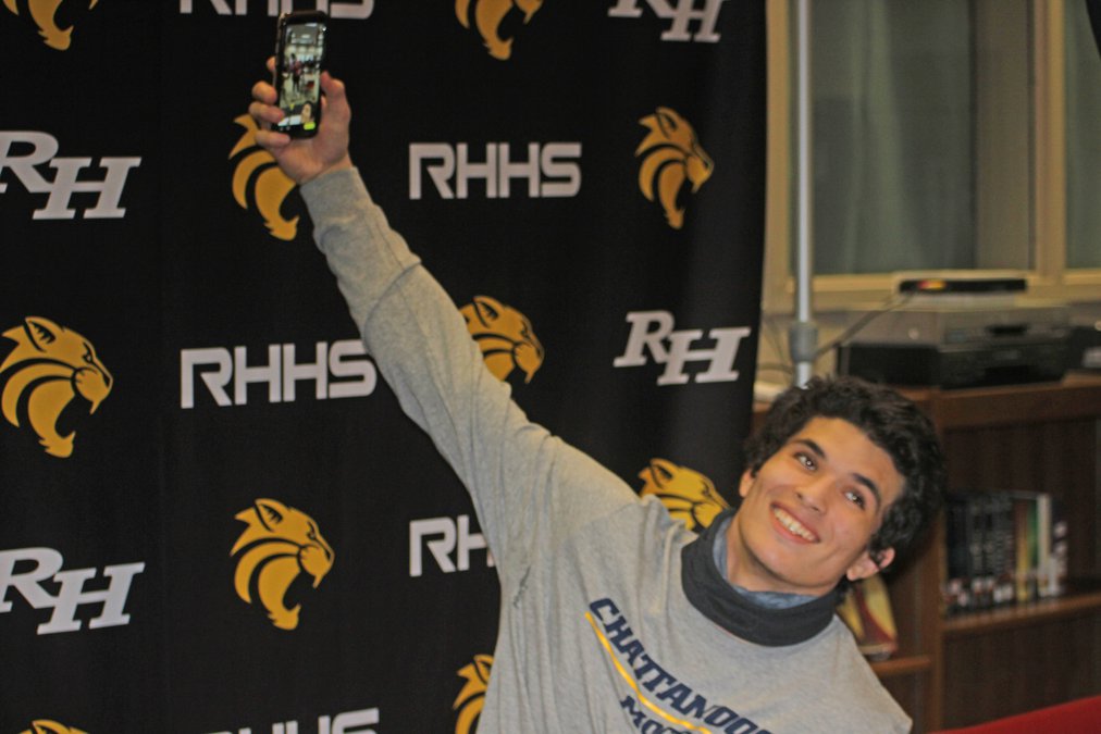 The teen took a selfie with news cameras in the background during his signing ceremony, smiling broadly.